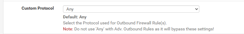 When creating an IPv4 outbound permit rule (Firewall --> pfBlockerNG --> Ip --> IPv4) and you leave the Custom Protocol on any you get the following error: