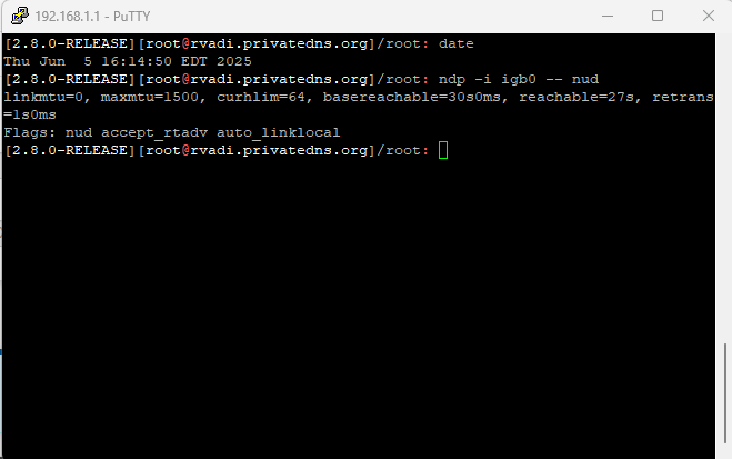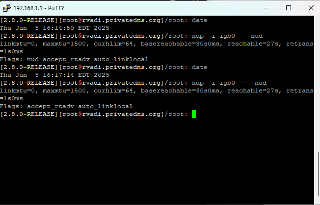 It appears that the 2.8.0 by default has setting of the NDP on the NICS enabled with a period of 30 secs. I have observed that when the NUD solicitations are sent out, and the neighbor responds, the interface stops forwarding traffic for a period of 7-9 secs. This happens consistently and degrades the IPV6 performance significantly. To mitigate the issue, I disabled NUD on the WAN IPv6 NIC, and this restored the clean connectivity, since the update then happens every 24 hours. To reproduce the issue, I will enable the NUD on the interface, capture traffic on WAN NIC (I do not have a mirror port, as the WAN NIC interface is directly connected to my ONT via ethernet), capture traffic on a workstation with a ICMP6 ping to www.amazon.com and demonstrate that the pings fail. The Dpinger also reports such packet drops, and can be observed on the capture from pfSense. On disabling NUD, the interface returns to clean connectivity (except I suppose when it sends the neighbor solicitation every 24 hours). From the captures (capture_from_pfsense) taken on the firewall.