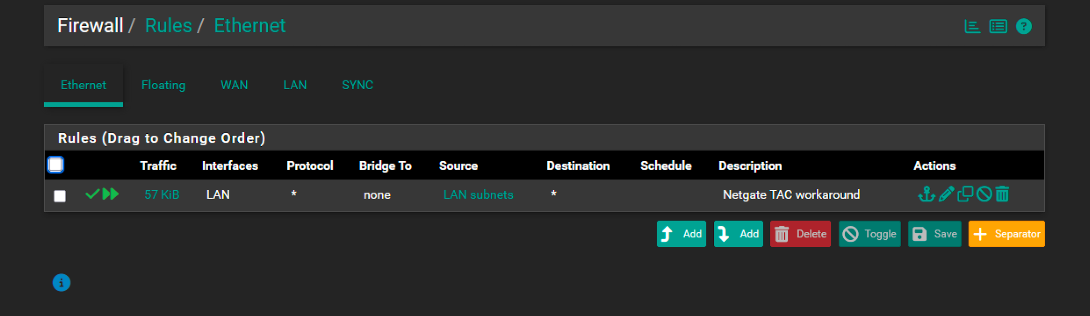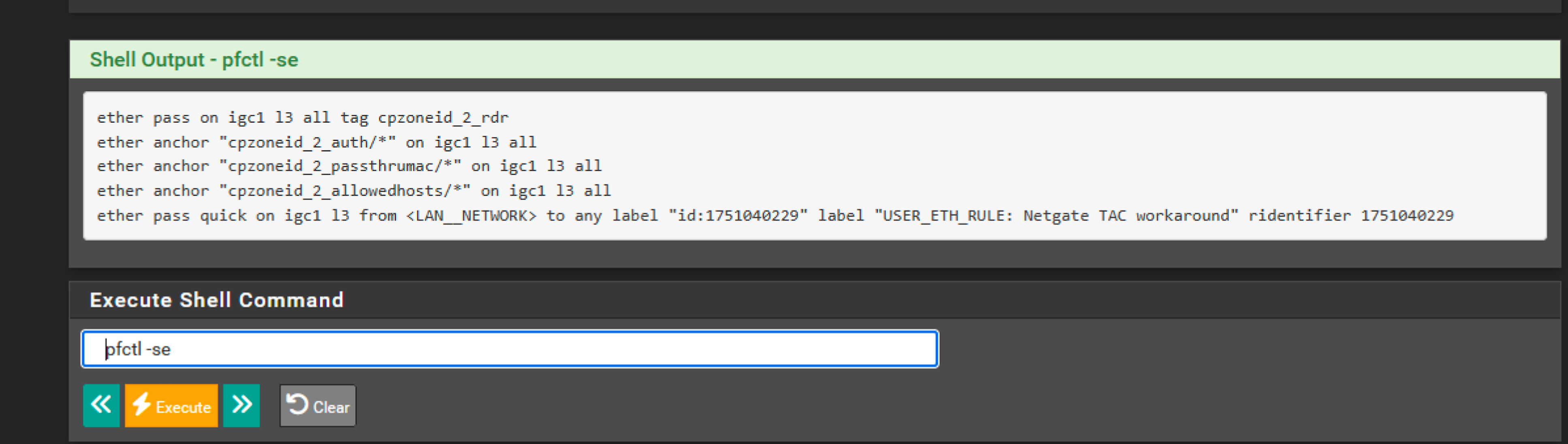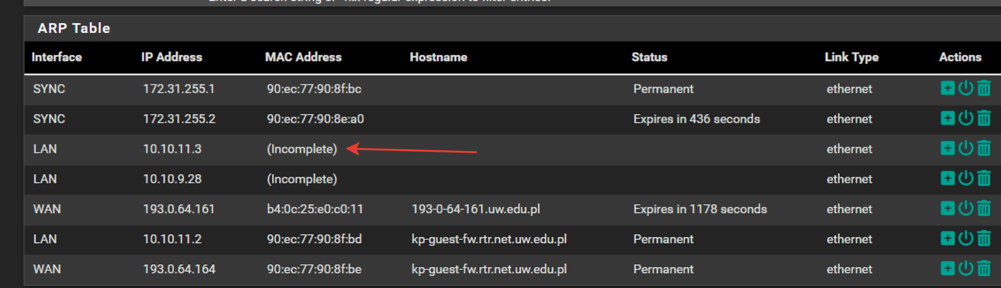 # pfctl -s ether ether pass on ix0 l3 all tag cpzoneid_2_rdr ether anchor "cpzoneid_2_auth/*" on ix0 l3 all ether anchor "cpzoneid_2_passthrumac/*" on ix0 l3 all ether anchor "cpzoneid_2_allowedhosts/*" on ix0 l3 all After the random time, the primary node stops passing the ARPs on IX0 for all hosts