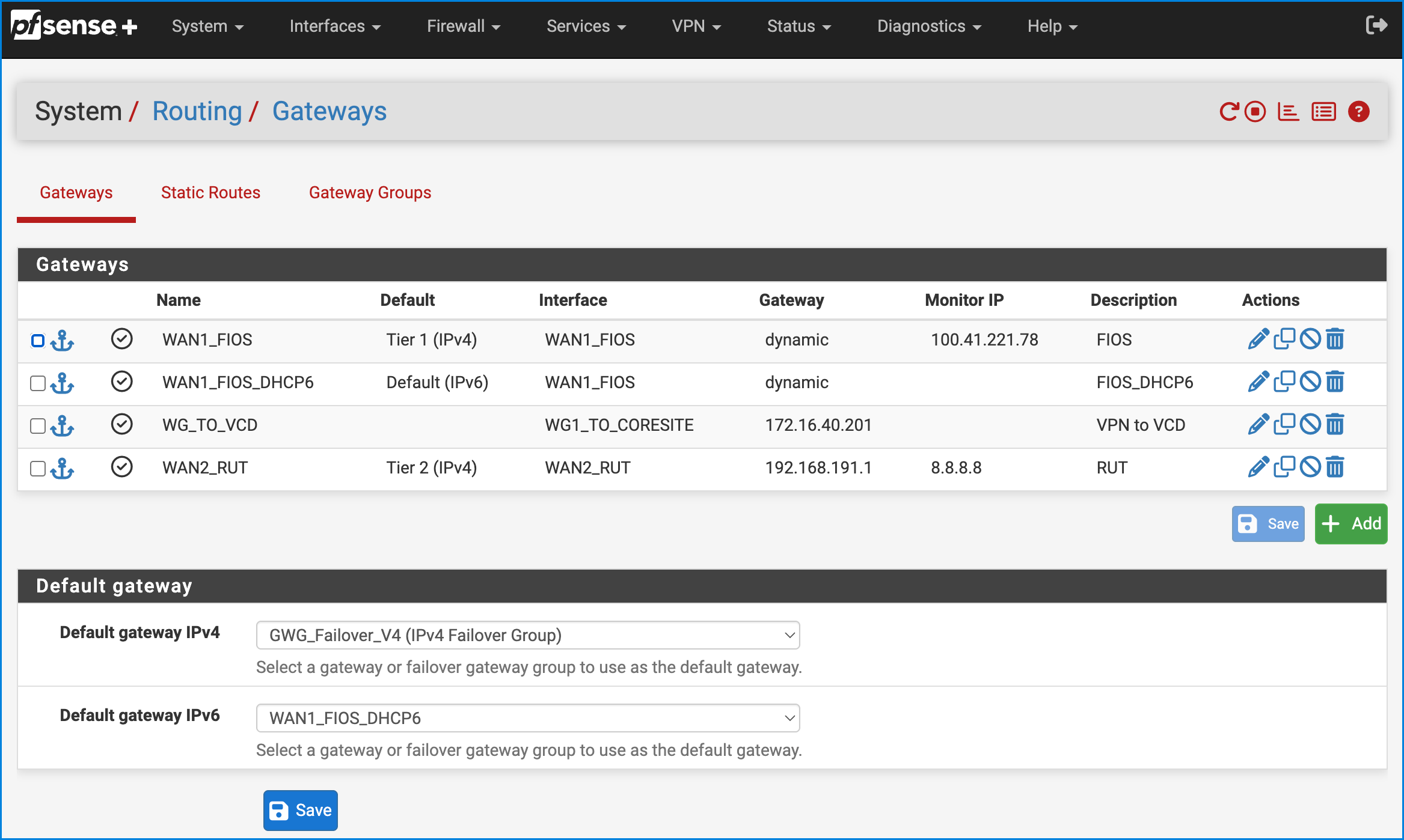 If I manually go to System > Routing and choose a specific V4 gateway (my Tier2) then things start to work again.