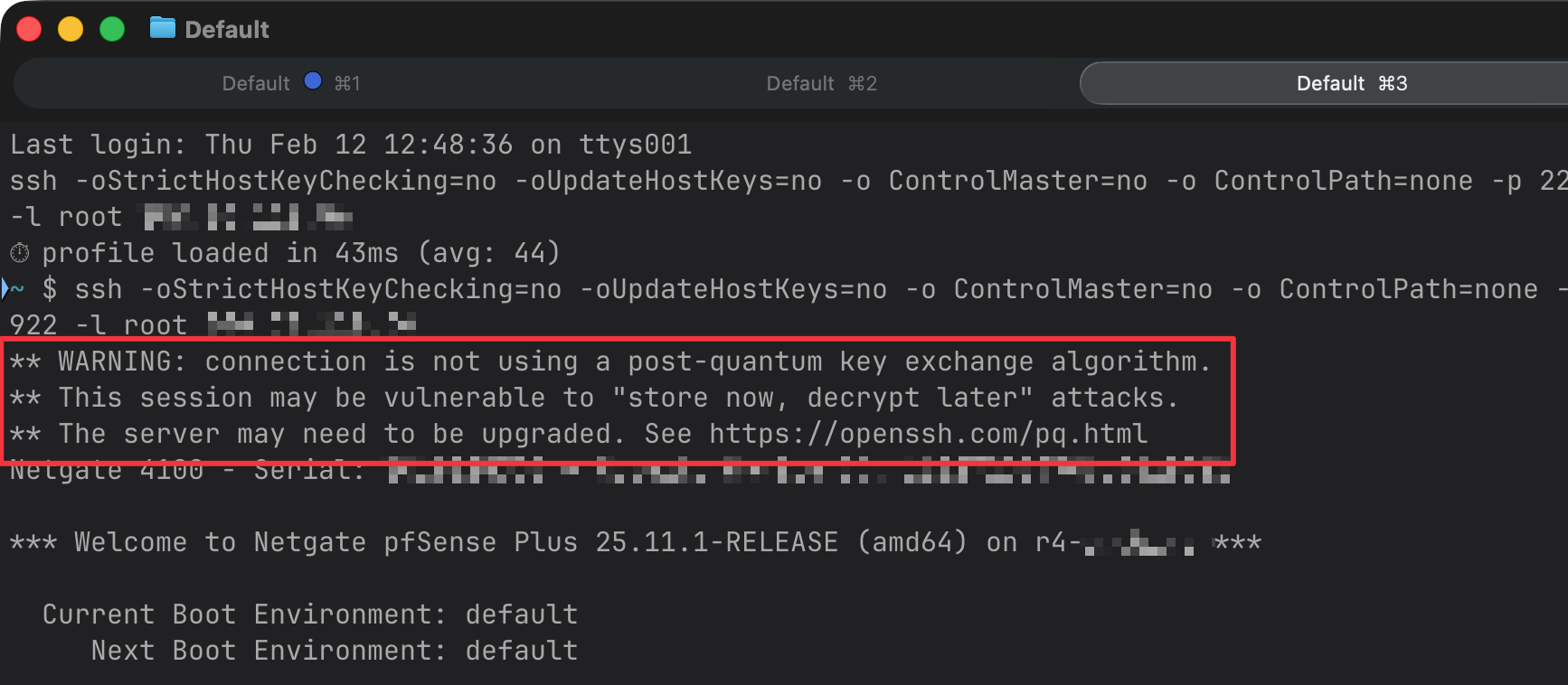 So you guys are kind of in an odd spot. The current "industry standard" key exchange algorithm you really should be using (hybrid ML-KEM + x25519) is not available in FreeBSD 15. For that you’ll need OpenSSL 3.5+ and OpenSSH 9.9+.