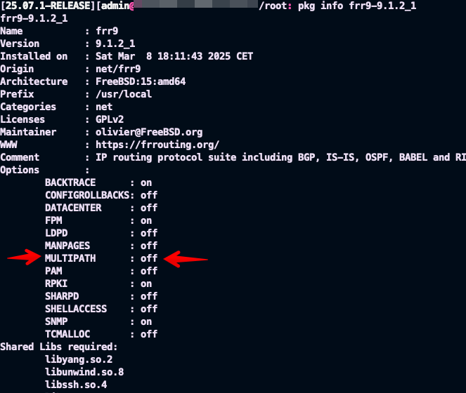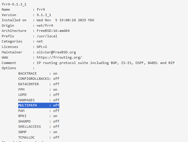 I can confirm that the frr9-9.1.2_1 was compiled with multipath disabled.