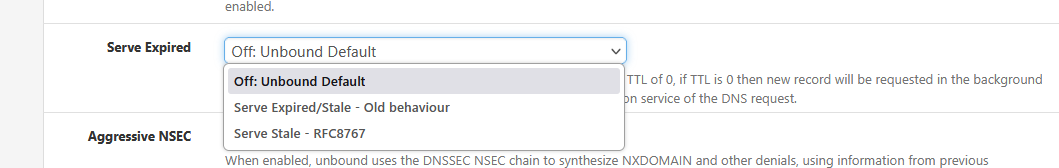 When set to off or RFC8767 the line isnt added at all, its designed this way so user's still have a way of configuring a customised 'serve-expired-client-timeout' in the custom box in the GUI. Also it will also not need patching again if for some reason the default value of this changes again in a newer Upbound version. This method would just inherit the new default.
