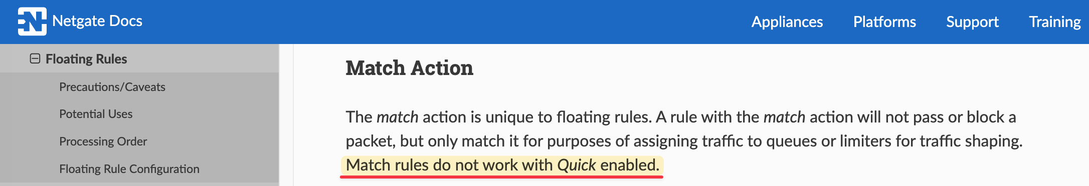 - Subject changed from GUI allows a Floating Rule with action=match and quick=enabled (which is invalid) to Floating Rules now work with action=match and quick=enabled