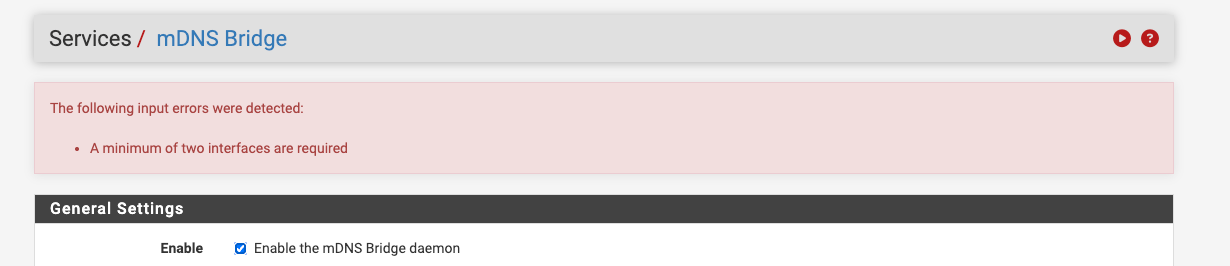 - Subject changed from PHP Fatal Error (TypeError) in mdns-bridge.php:74 on 25.11-SNAPSHOT when disabling service to PHP error when saving without interfaces selected interfaces