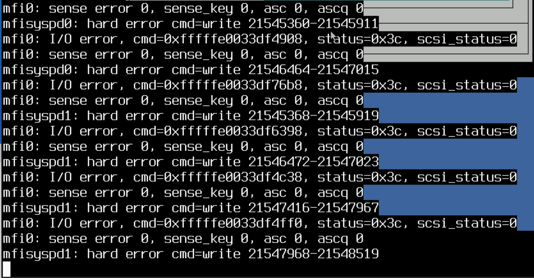 3. If I attempt an install in BIOS mode, I also see intermittent mfi(X) error messages. After the install is complete, the server will successfully boot into FreeBSD.