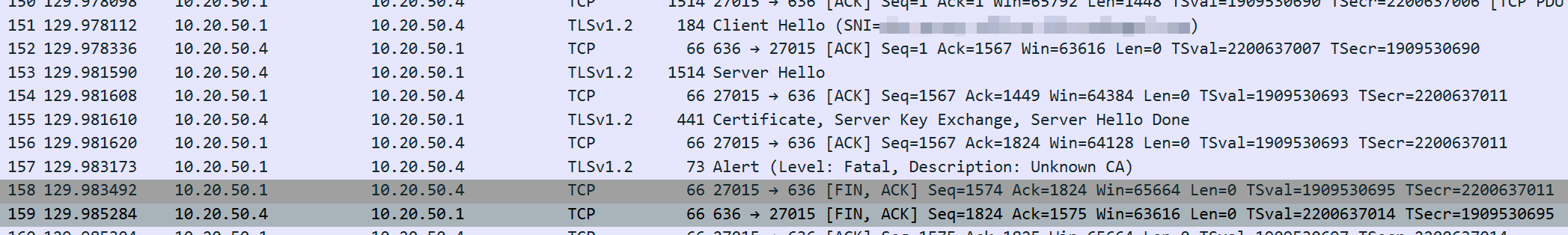 I have attached two screenshots from a Packet Capture (as seen from the pfSense LAN port, where the LDAP server resides). The first capture "successful-auth.png" shows the 6100 (10.20.50.1) making a successful auth query to the LDAP server (10.20.50.4) via TLS. The second image (failed-auth.png) is from ~45 seconds later, and shows a failed TLS handshake from the same system. There were no configuration changes or system alterations between these two auth attempts. There is a third screenshot with a little more info about the failed TLS handshake.