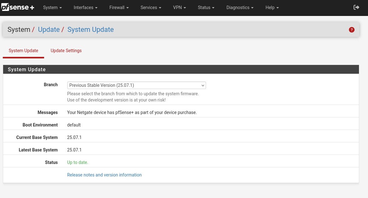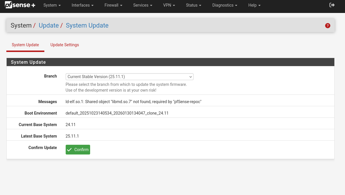 Tried to go back to a further version. 24.11 trying both 24.11 --> 25.07.1 and 24.11 --> 25.11.1. There is an error message in the gui screen System --> Update --> System Update.Error message: ld-elf.so:1 Shared object "libmd.so:7" not found, required by "pfSense-repoc"