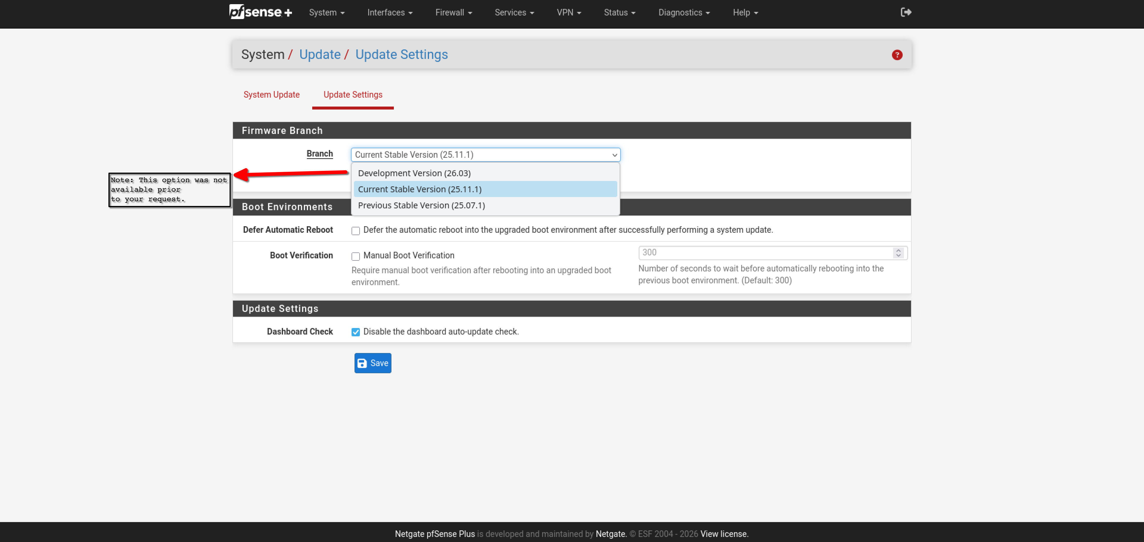 I am attaching a screenshot of the update screen settings and findings. That prior to your reply I never had the option to try and upgrade to 26.03 dev. It is there now and will try to perform this upgrade. First though I would like to know if you want me to perform it in the console with a console record like last time pfSense-upgrade -d or through the gui?