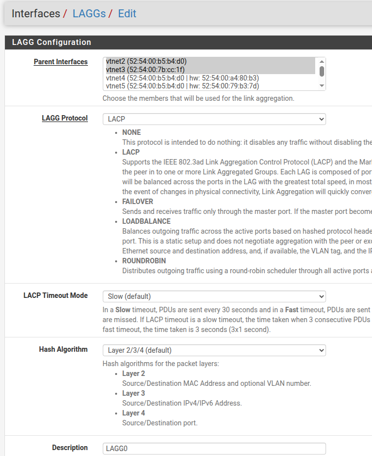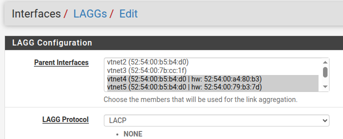 I've created LAGG0 on vtnet2 and vtnet3 ('Created LAGG0 on vtnet2 and vtnet3.png'), then I added 100 VLANs tied to LAGG0, assigned all these VLAN interfaces, enabled them and assigned static IPs on each of them.