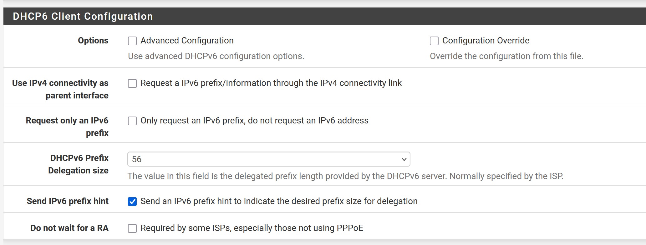 I am on pfSense plus 25.11.1 on a 6100 max. My ISP provides a /56 DHCPv6 prefix delegation (see screenshot). I use "track interface" for IPv6 on my LAN interfaces and all IPv6 connections/address assignments are working as expected.