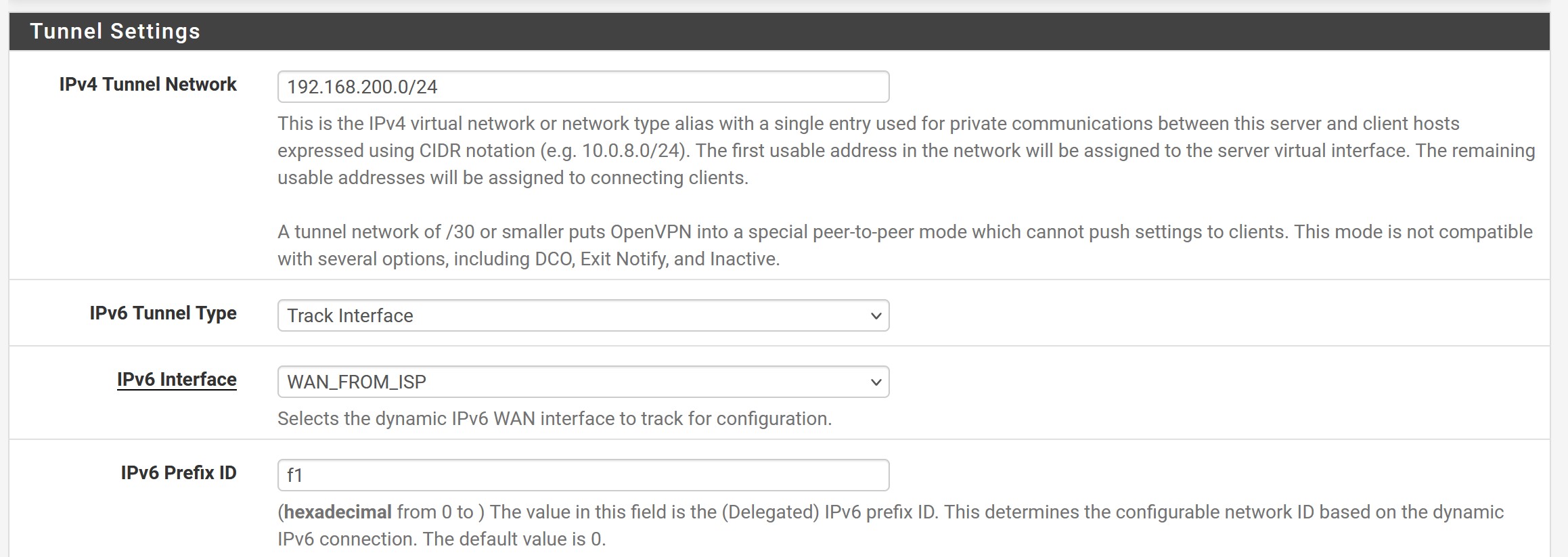 Please also note the end blank on the "(hexadecimal from 0 to )" on the OpenVPN prefix id settings verbiage. So it appears the IPv6 "track interface" option is not working for OpenVPN.